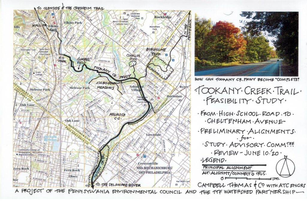 Since early 2019, PEC has been working closely with Cheltenham elected officials, staff, Environmental Advisory Committee members, and the Friends of the Tookany Creek Trail (which we created alongside community advocates from the ongoing planning process) to upgrade and expand existing sections of the Tookany Creek Trail to link into Philadelphia via the Cresheim Trail in Chestnut Hill and the Tacony Creek Trail in Tacony, Philadelphia. In early 2021, consultant Campbell Thomas & Co. completed a feasibility study for the Tookany Creek Trail in Cheltenham, which was later adopted by the Township. You can view that feasibility study here, and an Executive Summary here.