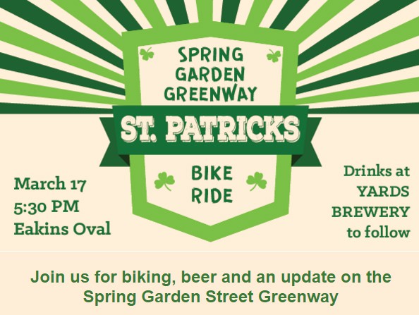 On St. Patrick’s Day we’ll meet in Eakins Oval and bike down Spring Garden Street. We’ll stop a few times along the way to learn about the plan to transform the corridor into a safe, bikeable urban boulevard. The ride will last approximately 45 minutes and we’ll end at Yards Brewing Company for drinks and discussion. Register here.