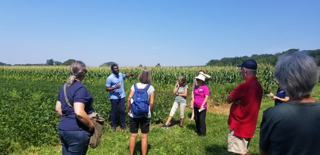The group, which included PEC’s Paul Racette, especially appreciated visiting the decades-long Farming Systems Trial research, which includes side-by-side comparisons of three types of farming systems: conventional pesticide/fertilizer “chemical” based system, cover crop organic system, and manure-based organic system. Paul and others were surprised to learn that according to comparisons of corn and soybean production, the most common crops in the U.S., the organic systems match conventional yields during normal or ideal growing conditions and exceed conventional yields during drought, while also better protecting soil, retaining water, costing less, and protecting water quality. Another attendee agreed, saying they never realized how important soil health is and how its degradation through some conventional farming practices is harmful to our waterways and our health. A third noted that not only did they learn more, but they also felt better prepared to speak about how farming practices affect watersheds and drinking water.