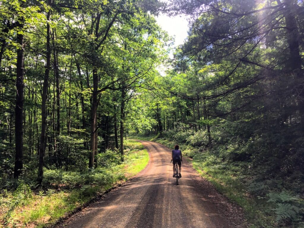 The route begins on pavement from Reeds Gap State Park on the eastern edge of the State Forest. The first few miles are rolling through rural “neighborhoods” and farmland. Keep staying right at each intersection as you loop around Thick Mountain and you’ll soon end up on gravel on Treaster Valley Rd., beginning a gradual climb. The true first climb begins after making a left onto Strongs Improvement Rd. around mile 10. Stay strong (get it?), keep those pedals turning, and you’ll soon be coasting down the other side into Havice Valley, where you’ll exit the forest again very briefly before beginning the single biggest climb of the day up Siglerville-Millheim Pike (or “S-M Pike” as it is known locally). This one is a doozy, gaining over 1,200 feet over three miles, but Big Valley Vista at the top is worth it, we promise. From this vantage point, you can see the classic central Pennsylvania dichotomy between the forested ridges to the northeast and the farmlands and in the distance, the town of Milroy, to the southwest.