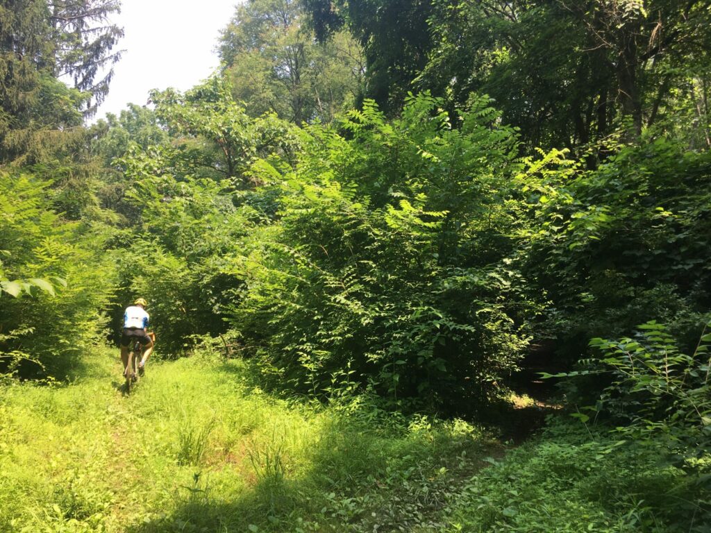 As you start climbing, Red Run will be off to the left of the road, and it’s a great opportunity to stop and dunk your hands, helmet and whatever else to cool off before another long climb. This climb is a consistent 5-6% for about 2 miles, but you gain an extra mile of descent for all that hard work. The descent back to Old Forge is twisty and fast, sure to make you smile! At Old Forge, fill up on water again if needed and this time, turn right on the pavement and go about a half mile to Swift Run Rd., the last big climb of the day. It’s also the longest, stretching almost 3 miles and gaining over 1000 feet of elevation. Stay straight at the top onto Snowy Mountain Rd. At the bottom of the descent, turn right onto Swamp Rd. and then make a quick left on the paved South Mountain Rd., then another quick right onto Coral Ridge Rd. At this point, there’s a short stretch that leaves the state forest and passes through a residential area. When Coral Ridge Rd. makes a hard right turn, stay left/straight. The road will soon turn to gravel and you’ll re-enter the state forest. Then it’ll turn into gated doubletrack, which descends through fields of wildflowers on a grassy and fairly smooth surface — not at all as chunky as Bricker Clearing Trail earlier.