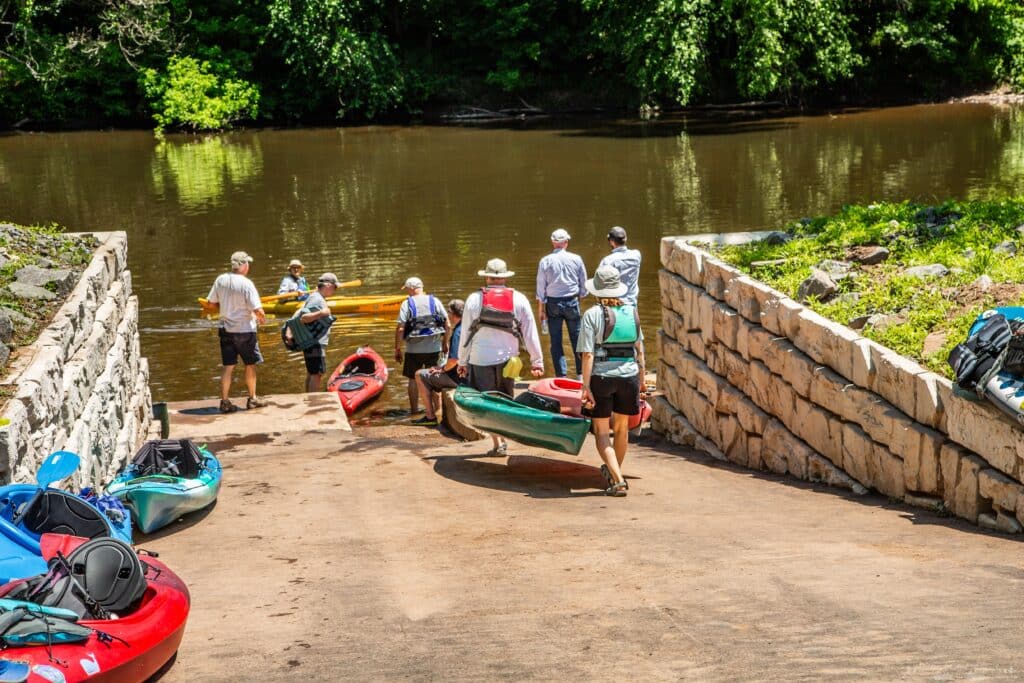 The Perkiomen Creek Water Trail offers 14 miles of navigable waters from south of Green Lane to just before its confluence with the Schuylkill River near Oaks, PA. The Perkiomen Trail, a 20-mile, multi-use trail, parallels the creek on a former railroad bed and provides a framework for access to the creek. The Water Trail is managed by the Perkiomen Creek Conservancy and is the newest of the designated Water Trails in the Commonwealth. The Conservancy, as well as local paddlers, are celebrating improvements to Collegeville’s Creekside Park where there is now a 15-car parking lot and paved access to the boat launch. The renovation, which included new landscaping, were funded in part by two Montco 2040 grants from the Montgomery County Planning Commission. Collegeville Borough, along with Ursinus College, formed a partnership with the Delaware Tribe of Indians who are the original indigenous inhabitants of Collegeville worked together to give the park a new name. As part of the Welcome Home Project for the Lenape people, which has included the reinternment of remains, reading important books, engaging in meaningful learning discussions, the park was renamed, “Pretty Place” in Lenape, or “Welakamike.”