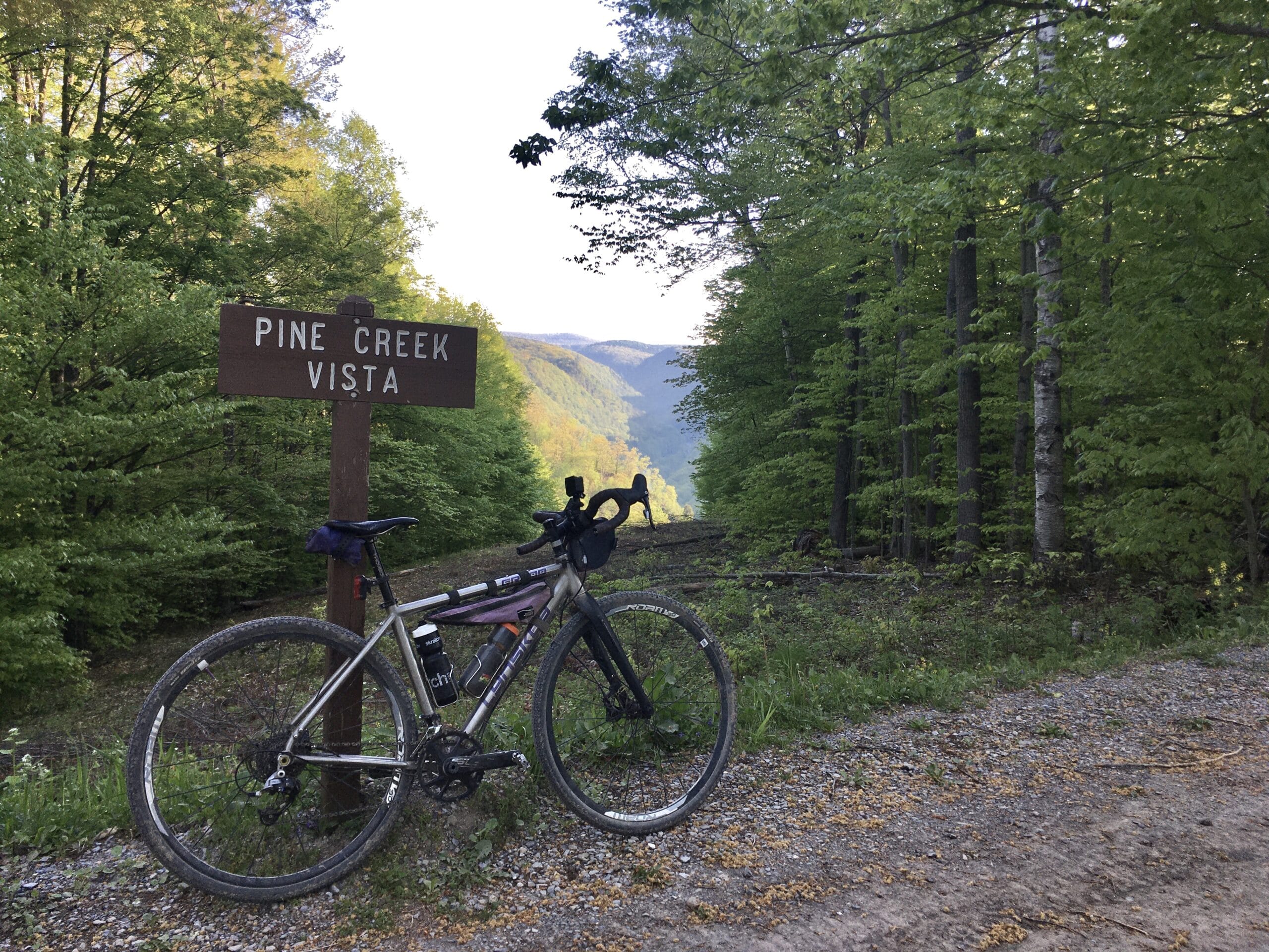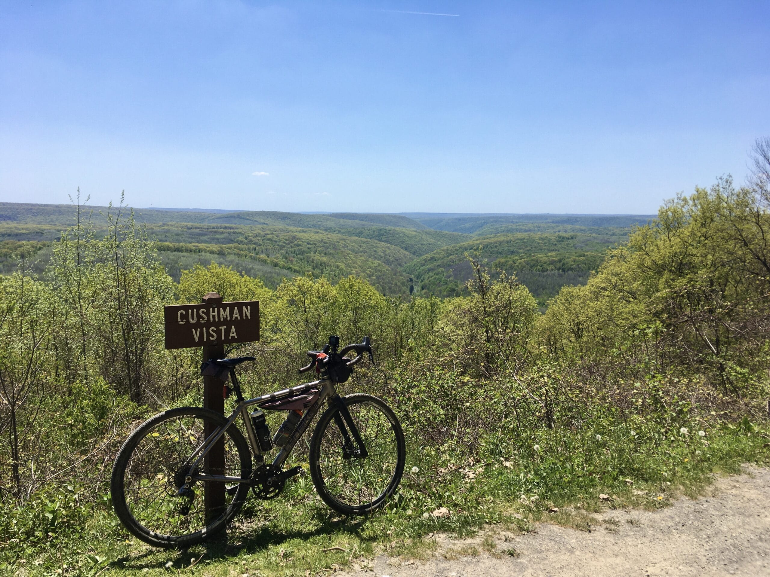 Colton Point State Park is located at the edge of the Pine Creek Gorge, also known as the Grand Canyon of Pennsylvania. It is the gateway for this ride at the northern end of the gorge, which hugs the west rim, drops to the Pine Creek Rail Trail, and climbs back up to the tops of squiggly ridges via long creek valleys. Get ready for a remote feel, plenty of vistas and little cell service. There are options to add some adventure and chunk, but the route as mapped sticks to gravel roads with only about a mile of pavement in the entire 63-mile ride.