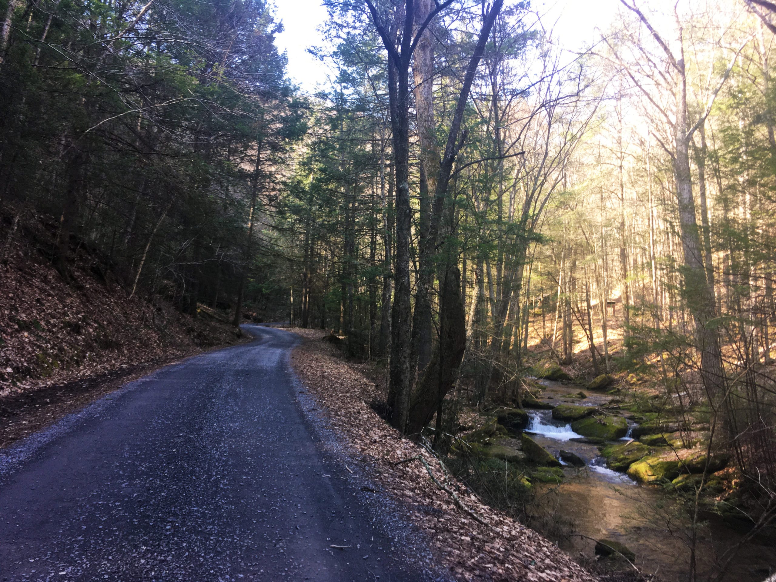 At a four-way intersection just past an open area, make a left on Bailey Run Road. You’ll pass a small square of private land and a few houses, then quickly enter state forest again for a while before popping out into a small village at the bottom just before the intersection with Rt. 872.