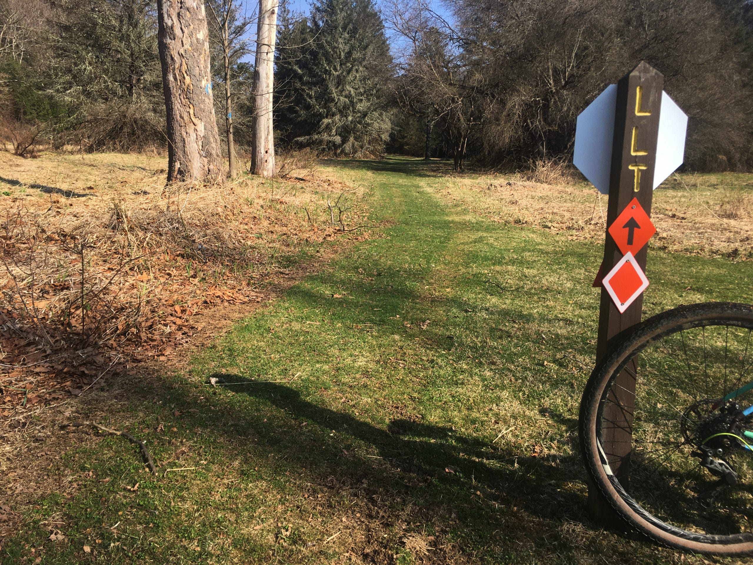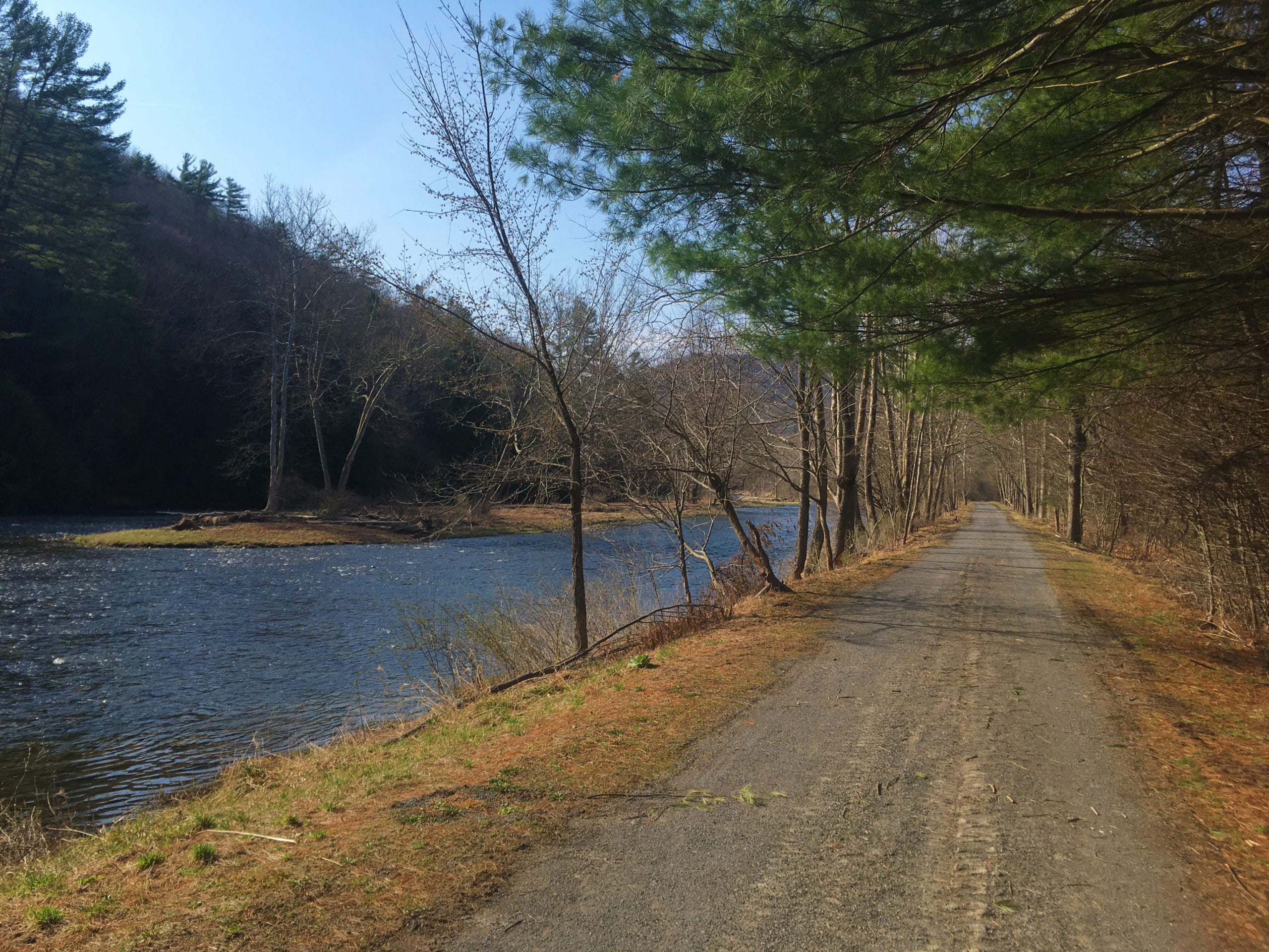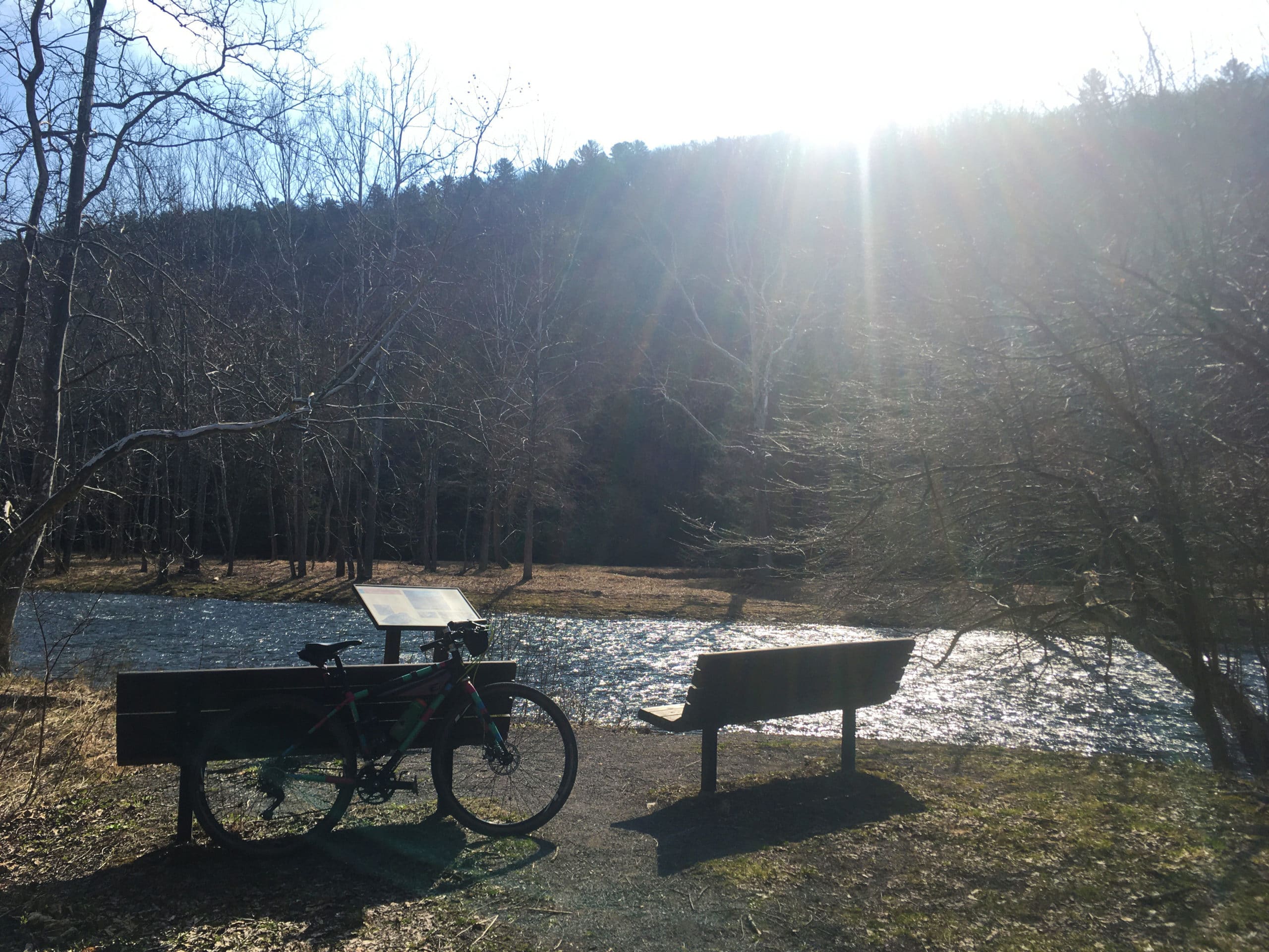 You’ll need to be on this paved roadway for about two miles, but it’s flat and fast and there is a decent shoulder. The First Fork of Sinnemahoning Creek lazily flows along on your left, lined with bright-white-barked sycamores. Turn left when you see a sign for Sinnemahoning State Park, and from a gravel parking lot you can pick up the Low Lands Trail, a multi-use path through the park along the river. Look for the universal orange snowmobile trail arrows, as well as wooden signs calling out the trail.