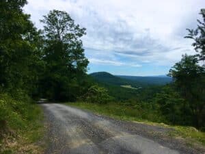 At the end of the TMT, a paved climb and then descent will bring you to Rt. 913, which you’ll climb gradually for just under a mile before making a left on Little Valley Rd. The shoulder on this stretch isn’t the best, so use caution. Little Valley Rd. trends uphill for a while but it provides plenty of breaks before the real climb begins on Bunn Mountain Rd. There’s no sugar coating it — Bunn Mountain is a beast. It’s steep and relentless, especially for the last half mile. It turns from paved to gravel and back to paved throughout its length, and it is paved for most of the steepest section. After cresting the top, you will be rewarded with a great view of layers of mountains looking northeast, mountains you’ll soon be in.