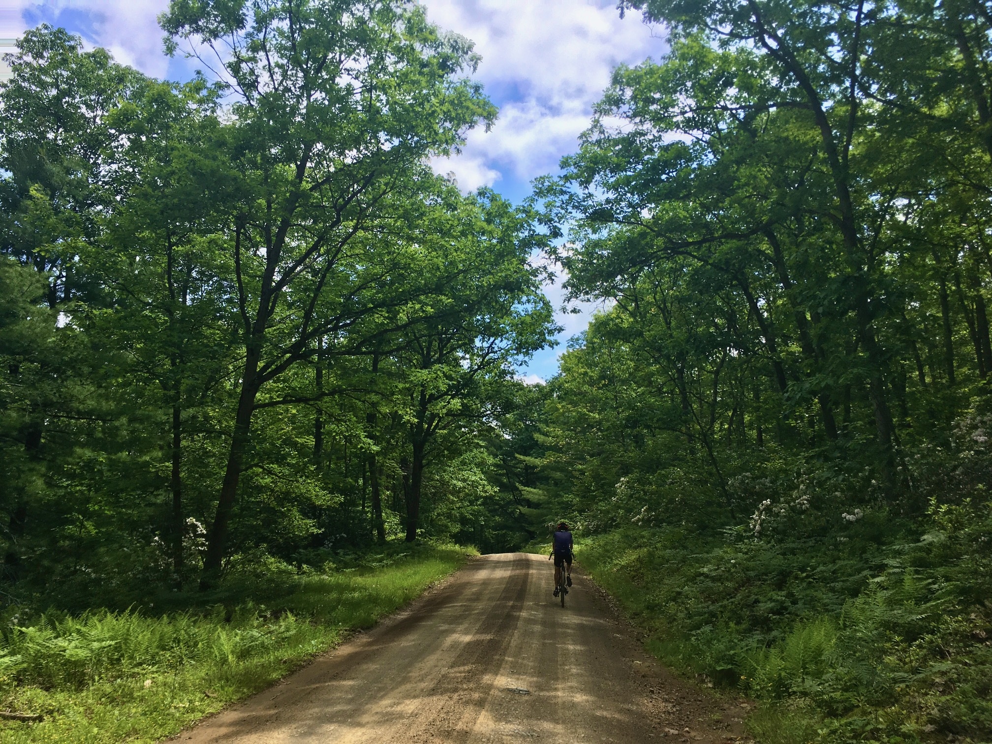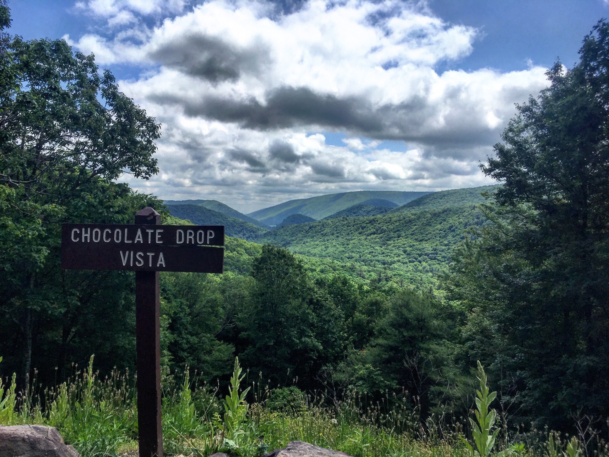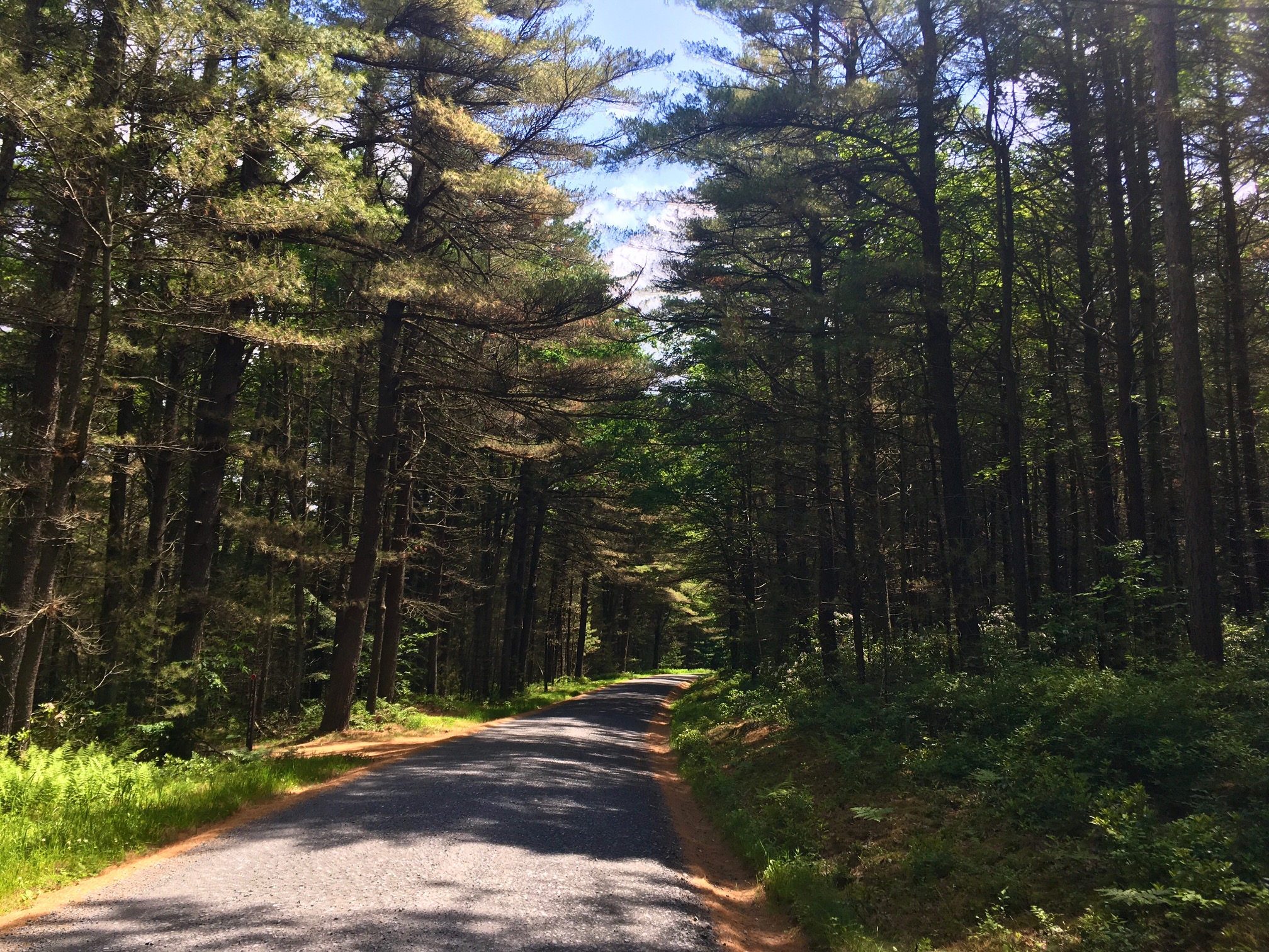 The other side of this monster climb is a bit more gradual. Stay right at the intersection with Sand Mountain Rd. and then again onto the paved Poe Valley Rd. You’ll pass Poe Valley State Park and its lake and swimming area, then stay left onto Pine Swamp Rd. Partway up this climb, Chocolate Drop Vista will call to you from your right. Take a moment to appreciate the view of uninterrupted mountains and the one round knob in the center — the “chocolate drop.” Farther up the climb, the dirt road turns a reddish orange color, which stands out in stark contrast with the deep green of pine trees lining the road.