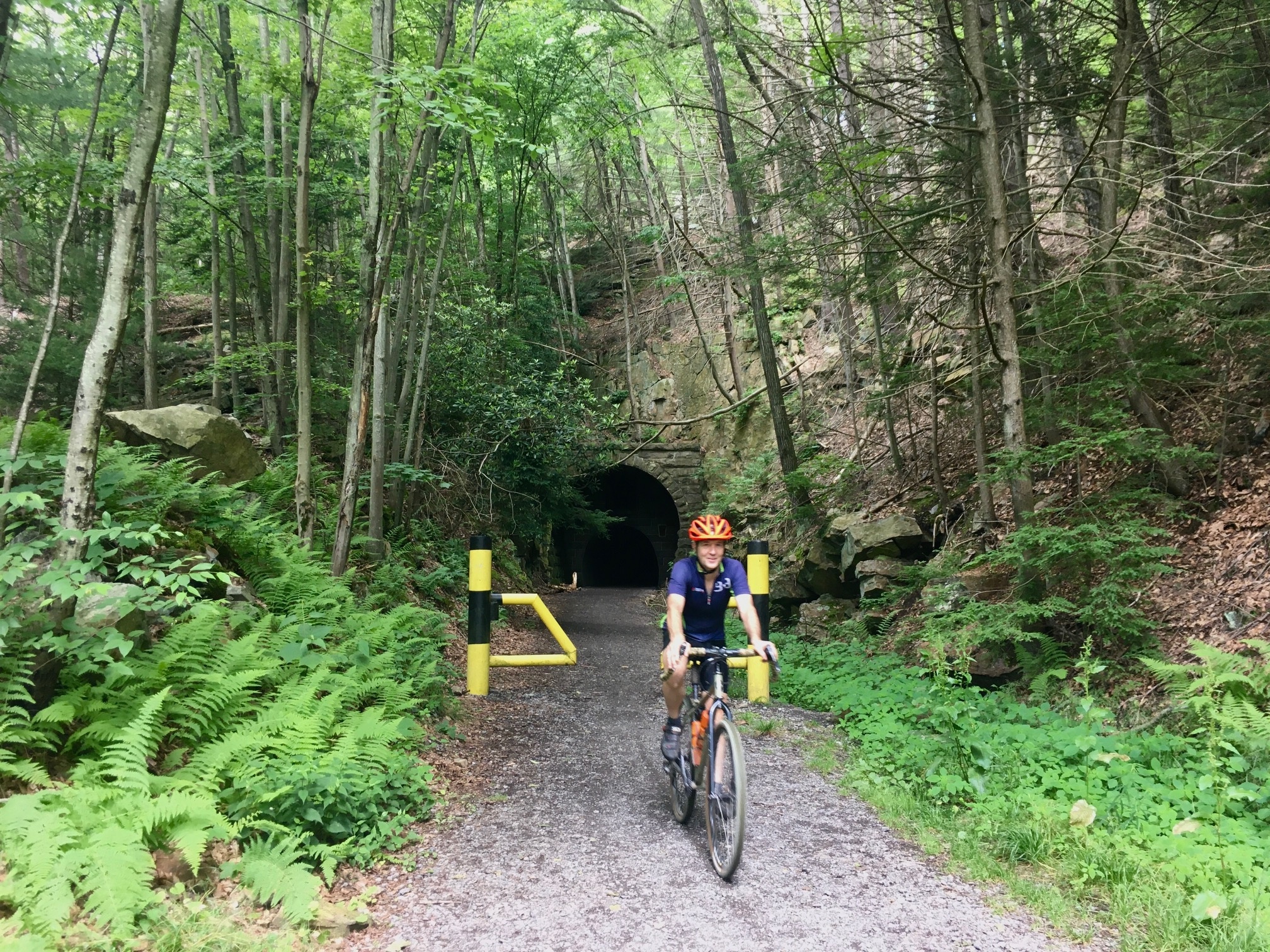 At the bottom of the descent, Poe Paddy State Park offers a mid-ride water stop in the form of a spigot behind the restroom. Take a moment to refill bottles if you need and then head out on Tunnel Spur Rd. After just under a mile, you’ll make a right onto the Penns Creek Rail Trail, cross Penns Creek, and go through a tunnel. The tunnel has been improved from years past, when the trail surface inside was bumpy and rough. Now, it’s all paved with concrete so it’s smooth rolling. The tunnel itself is slightly curved so it can be disorienting, but it’s not long and you can always see a light at the other end.