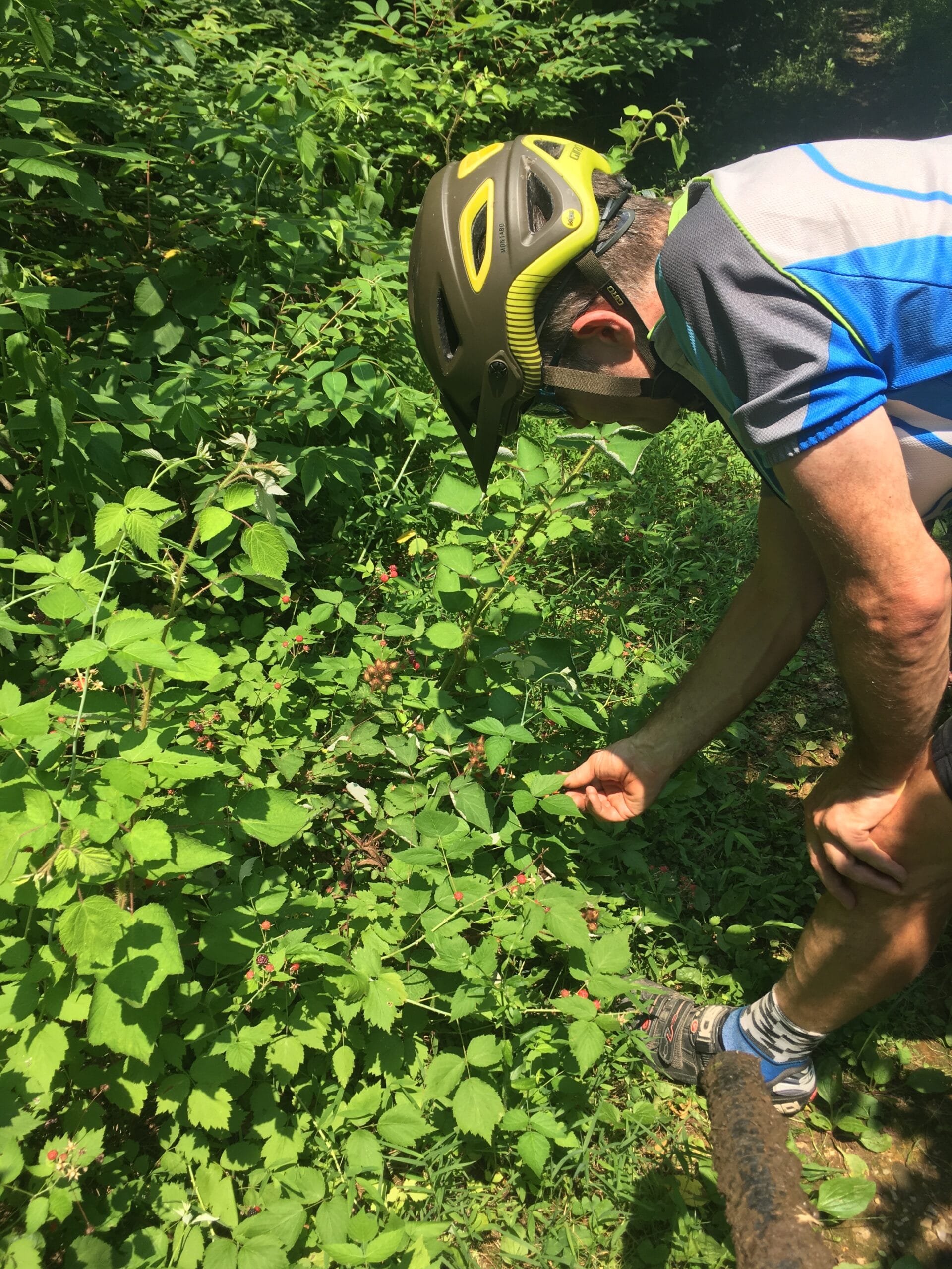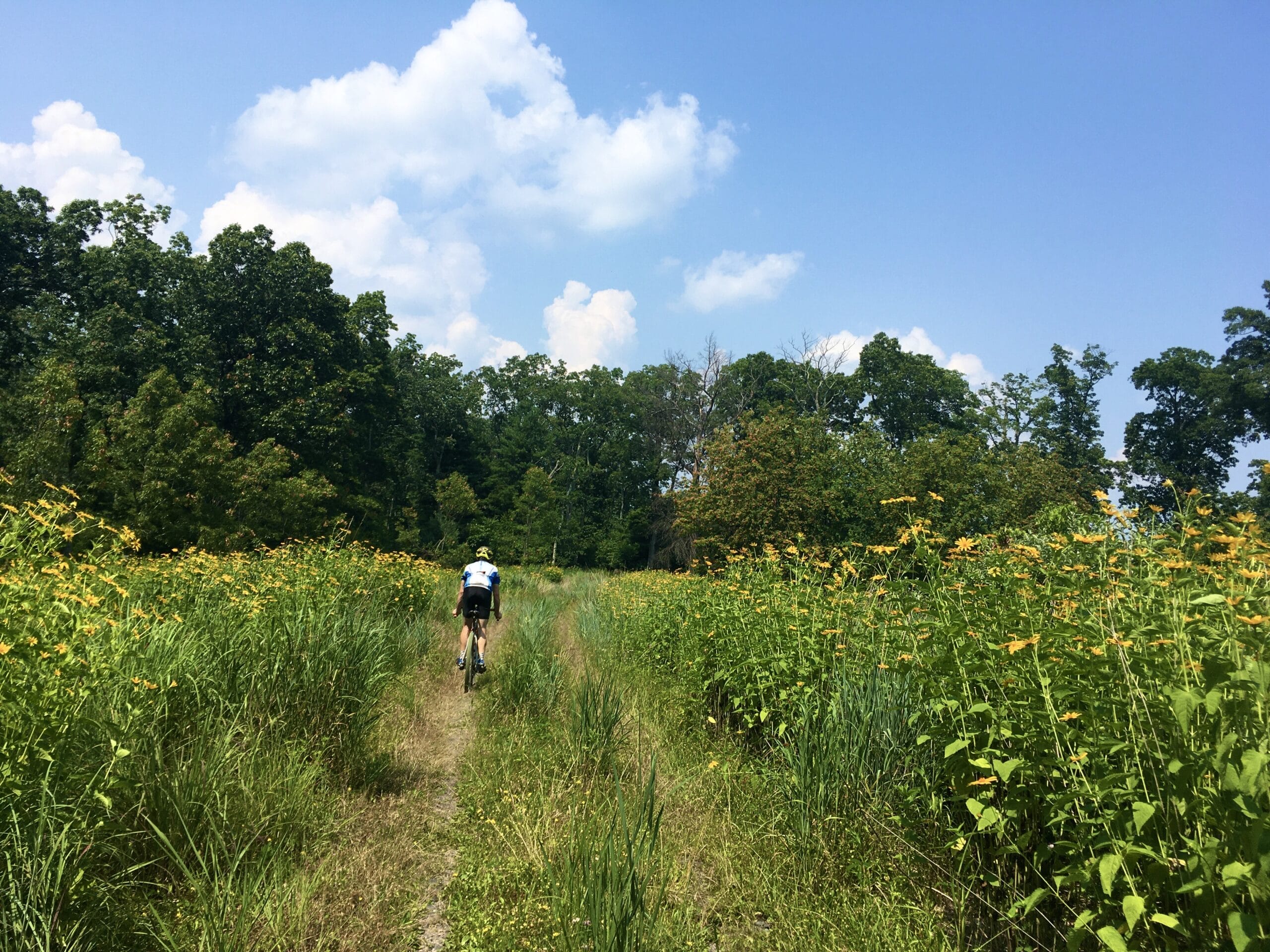 As you start climbing, Red Run will be off to the left of the road, and it’s a great opportunity to stop and dunk your hands, helmet and whatever else to cool off before another long climb. This climb is a consistent 5-6% for about 2 miles, but you gain an extra mile of descent for all that hard work. The descent back to Old Forge is twisty and fast, sure to make you smile! At Old Forge, fill up on water again if needed and this time, turn right on the pavement and go about a half mile to Swift Run Rd., the last big climb of the day. It’s also the longest, stretching almost 3 miles and gaining over 1000 feet of elevation. Stay straight at the top onto Snowy Mountain Rd. At the bottom of the descent, turn right onto Swamp Rd. and then make a quick left on the paved South Mountain Rd., then another quick right onto Coral Ridge Rd. At this point, there’s a short stretch that leaves the state forest and passes through a residential area. When Coral Ridge Rd. makes a hard right turn, stay left/straight. The road will soon turn to gravel and you’ll re-enter the state forest. Then it’ll turn into gated doubletrack, which descends through fields of wildflowers on a grassy and fairly smooth surface — not at all as chunky as Bricker Clearing Trail earlier.