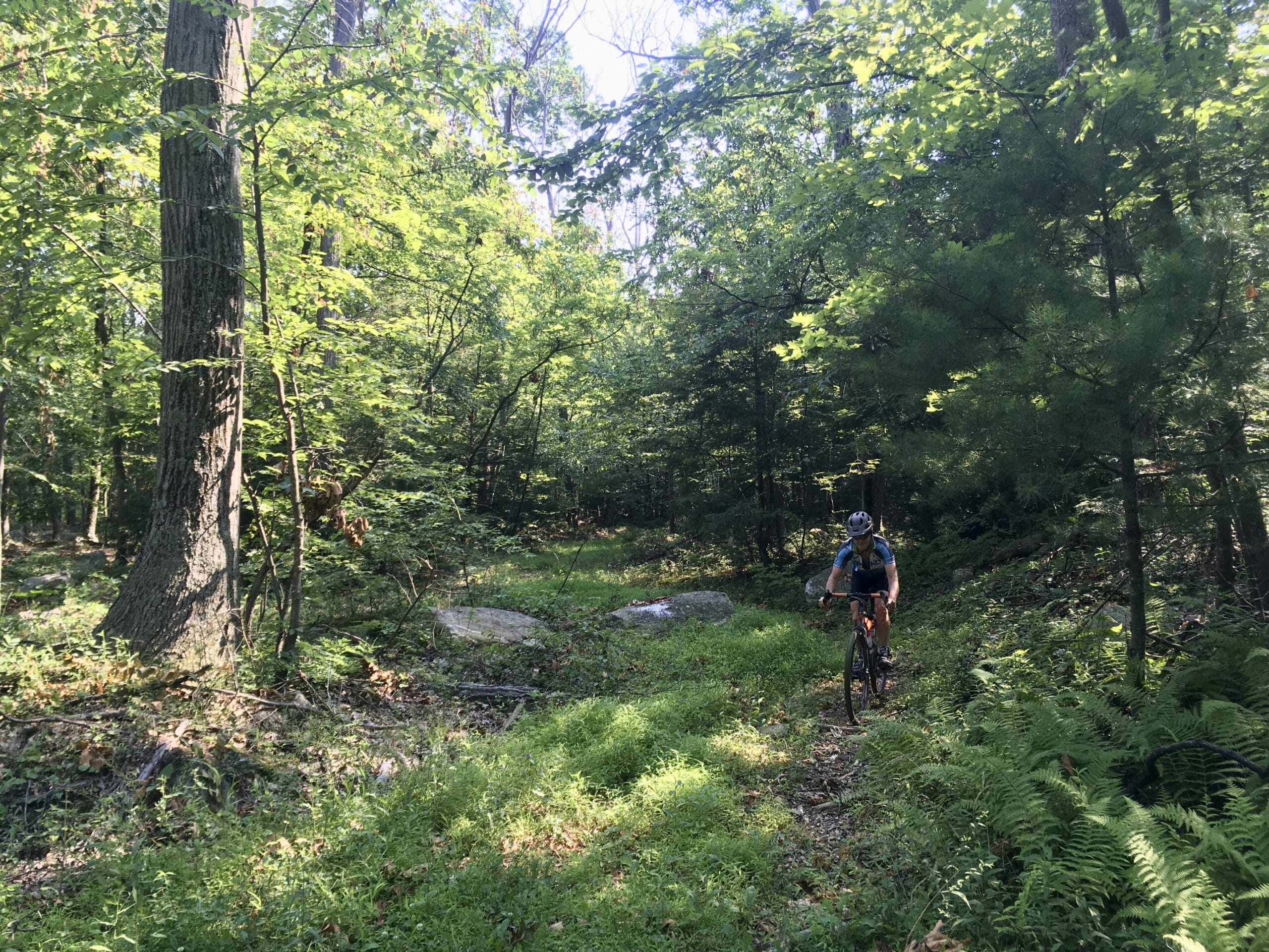 The road climbs and then descends down to Caledonia Lake, where the route makes a sharp left to stay on District Rd. Another gradual climb takes you to the intersection with Teaberry Rd., but the route continues straight through the gate onto Hogan House Rd., another section of doubletrack — this one more gravelly than grassy. Climb some more, stay right at the next intersection, and you’ll be rewarded with a section of flowy, gradual downhill along Green Ridge Trail. The snowmobile trail dumps out onto Cold Spring Rd., where you have the option of following the pavement for just under a mile or hopping on an unnamed snowmobile trail, which starts out smooth but gradually grows more chunky as it nears High Rock Rd. Choose the adventure that suits you best.