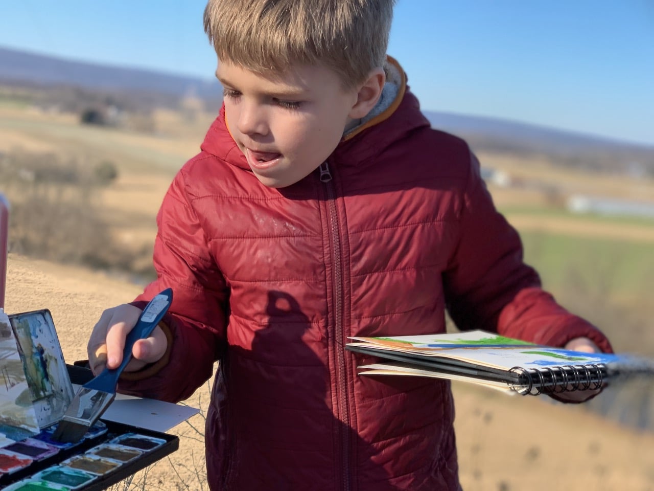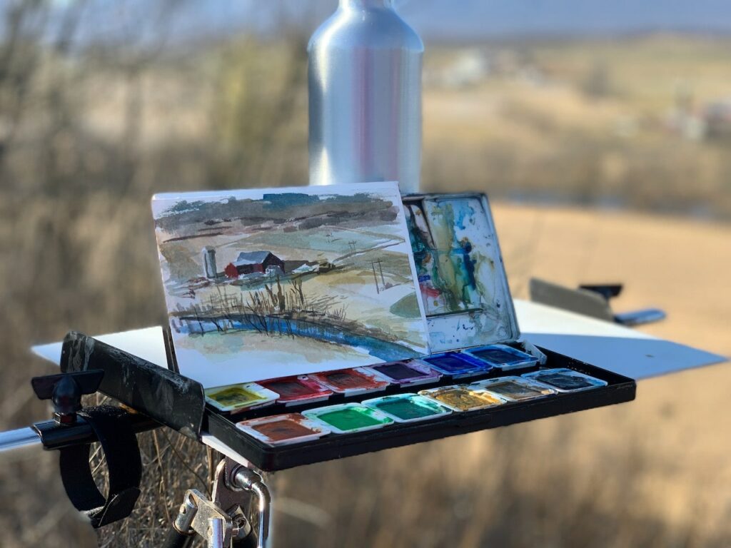 Just as watershed organization volunteers love to share their knowledge, awareness, and passion for water resource protection and conservation, David is passionate about sharing his work with the local community — and even closer to home, his family. David recently took his son on a hike on a local trail along Buffalo Creek, bringing with them some watercolors and paper. As they reached the ridge overlooking an expanse of farmlands and the creek flowing below, they stopped to paint. They noticed the still muted colors of early spring, but also the new pops of green. They talked about the different blues and greys of the water and the sky.