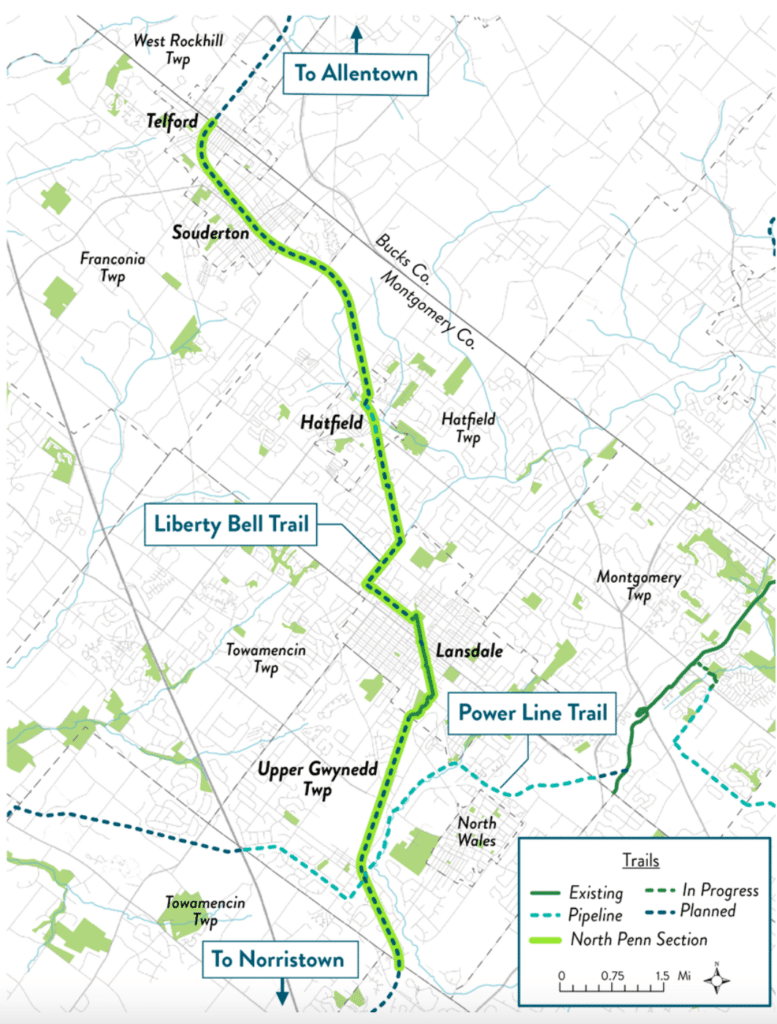 Eight municipalities in Montgomery County are collaborating with the Pennsylvania Environmental Council and consulting firm Michael Baker International to advance the planning of the Liberty Bell Trail (LBT). Those municipalities include Upper Gwynedd Township, North Wales Borough, Lansdale Borough, Hatfield Township, Hatfield Borough, Franconia Township, Souderton Borough and Telford Borough. A prior LBT Feasibility Study completed in 2005 investigated the potential development of the former 25-mile Liberty Bell Trolley route between Norristown and Quakertown into a trail network for walking and bicycling.